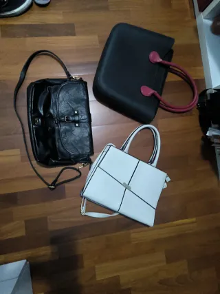 Set di tre borse da donna, un mix di eleganza e praticità. Vendo set di tre borse acquistabili anche separatamente 10€ quella nera con manico rosso e quella bianca 15€ quella nera di pikla con tracolla e borsa tipo 24h - Borsa nera in ecopelle con tracolla. - Borsa nera con manici rossi. - Borsa bianca con dettagli neri e tracolla.