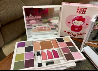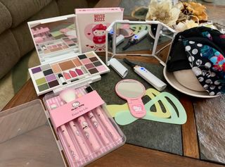 Set trucco composto da 7 pezzi: 1. pennelli trucco Hello Kitty, nuovi in scatola originale. 2. Trousse Hello Kitty, nuova in scatola originale. 3. Turbante per capelli, nuovo. 4. Coppia forme trucco ombretto e sopracciglia. 5. Specchietto con ingrandimento laterale ed illuminazione led centrale (pila esclusa). 6. Specchietto da borsetta Hello Kitty. 7. Arriccia ciglia a caldo, ricarica con cavetto usb (non incluso). Non vendibili singolarmente.