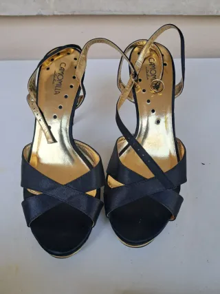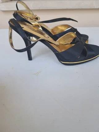 Eleganti sandali in raso con dettagli dorati. - Materiale: raso - Colore: nero e oro - Design con fasce incrociate - Cinturino regolabile alla caviglia