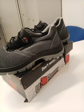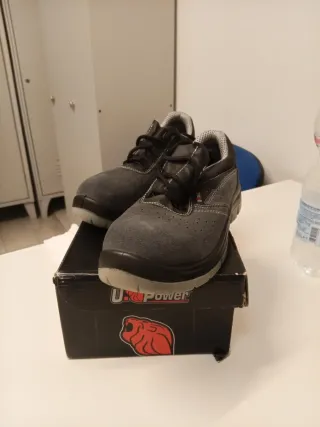 Scarpe da lavoro U-Power in ottime condizioni. - Tomaia in scamosciato grigio con microforature. - Inserti in tessuto tecnico. - Suola bicolore grigio e nera. - Lacci neri.