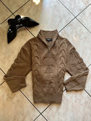 Maglioncino in maglia color marrone con dettagli a treccia e zip. - Collo alto con zip. - Maniche lunghe. - Design a treccia.