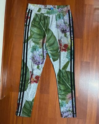 Leggings Adidas con una stampa floreale vivace. Presentano le iconiche tre strisce sui lati. Taglia S - 40 - Stampa floreale con fiori e foglie. - Tre strisce nere sui lati.
