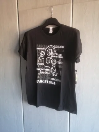T-shirt nera con stampa Barcellona e un disegno stilizzato. - Stampa frontale con testo ripetuto. - Disegno a forma di lucertola.