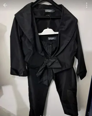 Elegante completo pantalone firmato Camomilla. - Giacca con scollo a scialle e chiusura con fiocco. - Pantalone a sigaretta. - Tessuto satinato.