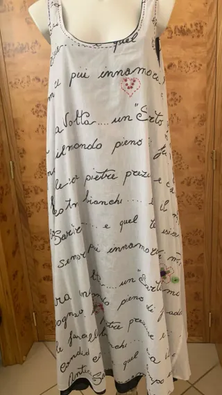 Bellissimo vestito lungo con stampa di testo e cuori ricamati. - Stampa di testo in corsivo nero su fondo bianco. - Dettagli di cuori rossi e verdi ricamati. - Scollo rotondo con bordatura nera. - Fondo con pizzo nero.x misure precise e imperfezioni vedi foto