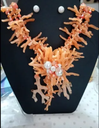 Set di collana e orecchini con elementi che ricordano il corallo. - Design unico e colorato. - Perle decorative aggiunte. - orecchini con perline
