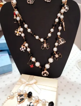 Set coordinato di collana, orecchini e bracciale. - Design con perle e dettagli. - Elementi decorativi a tema.