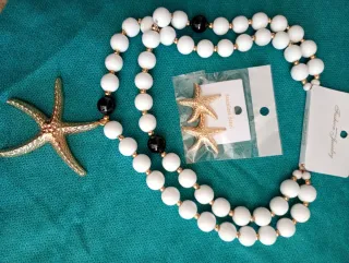 Set di collana e orecchini con dettagli a forma di stella marina. - Perle bianche. - Elementi neri. - Dettagli dorati.