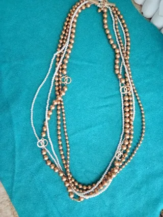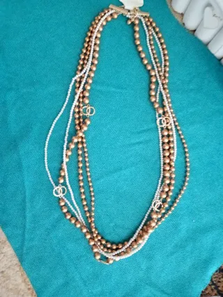 Elegante collana multistrato con perle. - Design a più fili. - Dettagli a forma di doppio cerchio. - Chiusura a T dorata.