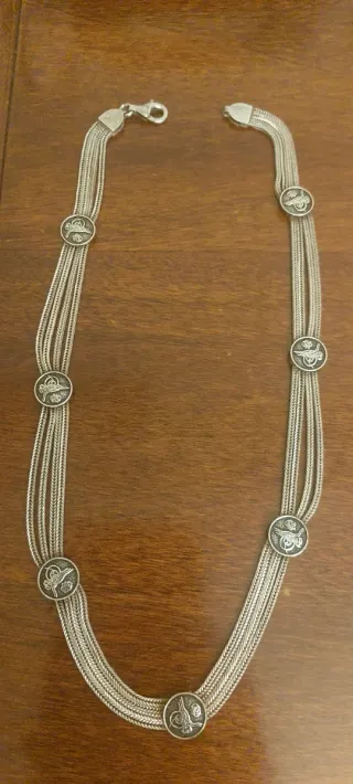 collana vintage realizzata in argento 925 punzonato, massiccio. - Design a più fili - Decorata con fregi circolari. - Chiusura a moschettone. Pezzo unico da collezione