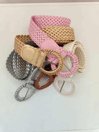 Set di cinque cinture da donna con design intrecciato. - Cinture con fibbia rotonda. - Materiale intrecciato. - Diverse colorazioni disponibili. Misura 115 cm