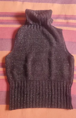 Gilet corto in lana con fili argentati. - Tessuto morbido e caldo. - Design senza maniche. - Collo alto a lupetto.