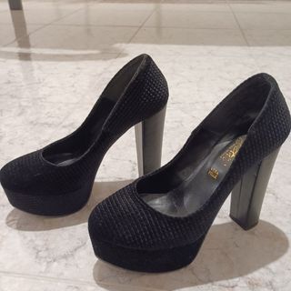 Scarpa décolleté con tacco alto nera numero 37. Tacco 12 , plateau di 4 cm. Tessuto effetto velluto tramato,con interno in vera pelle. Usati 2 volte Con scatola