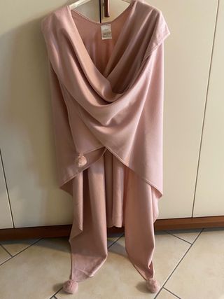 Mantella colore rosa antico, perfetta per aggiungere un tocco di calore e stile. - Dettagli con pompon in pelliccia. - Tessuto soffice al tatto. - Lunghezza massima 120 cm, multi taglia.