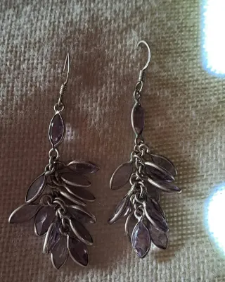 Deliziosi orecchini pendenti in bigiotteria. - Design a grappolo con elementi a forma di foglia. - Pietre color ametista. - Montatura in metallo color argento. - Lunghezza cm 7