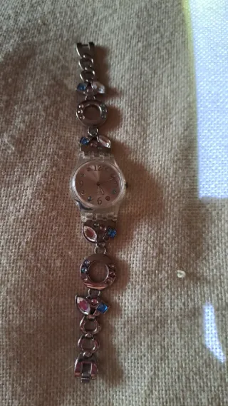 Orologio Swatch Menthol Tone, un pezzo unico degli anni '90. - Cinturino con decorazioni a forma di fiore e pietre colorate. - Quadrante trasparente con numeri e indici. - Chiusura a scatto. - Adatto a polso piccolo perché accorciato, lunghezza cm 16