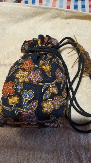 Elegante borsetta a sacchetto con un vivace motivo floreale. - Decorata con perline colorate. - Chiusura a coulisse. - Dettagli ricamati.