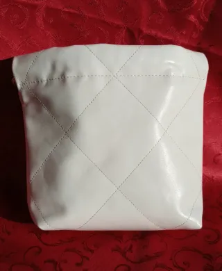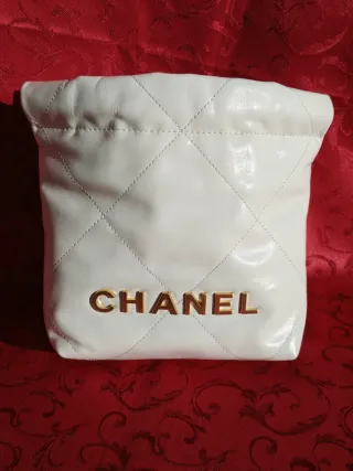 Elegante borsetta Chanel 22 MINI trapuntata, realizzata in pelle di vitello lucida trapuntata di colore bianco con hardware effetto dorato. Fa parte della collezione "Borse Hobo" di Chanel. Modello: Chanel 22 Mini. Materiale: Pelle di vitello lucida trapuntata. Colore: Bianco con logo e hardware color oro. Design: Presenta una tracolla a catena intrecciata con pelle e un ciondolo rotondo con il logo CC, che le conferisce versatilità per essere portata in vari modi. Dimensioni: Le sue misure son