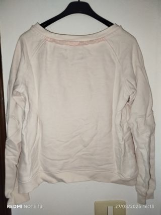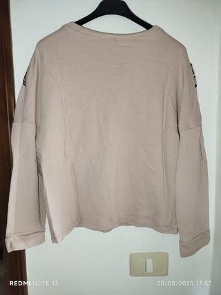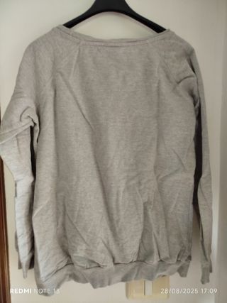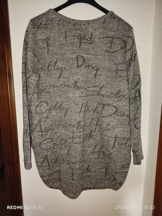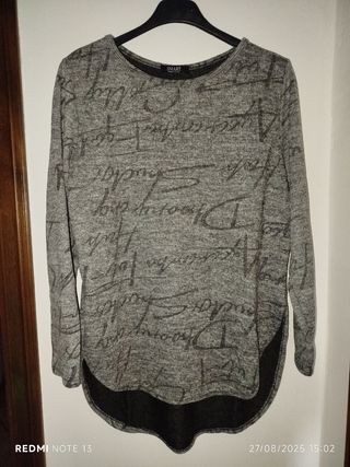 Maglioncino girocollo con una stampa di scritte. - Maniche lunghe. - Orlo arrotondato con inserto in tessuto nero. - Un po' più corto davanti e più lungo dietro. - Taglia non specificata ma veste comodamente una M/L.