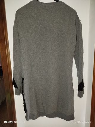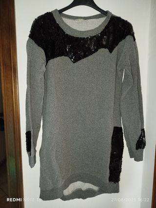Maglione lungo con dettagli scintillanti. - Maniche lunghe. - Applicazioni di paillettes sul davanti e sui polsini. - Tasche sui fianchi. Taglia non specificata ma veste una L/XL.