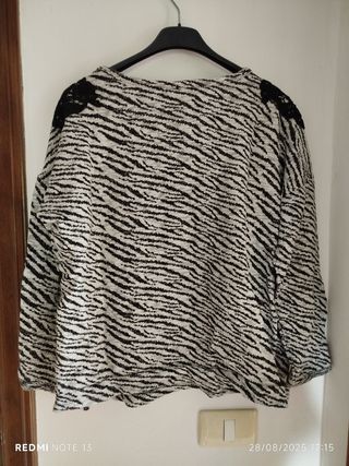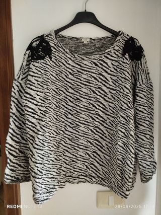 Maglia spessa con una fantasia zebrata in bianco e nero. Presenta dettagli in pizzo nero sulle spalle. - Fantasia zebrata - Dettagli in pizzo nero sulle spalle