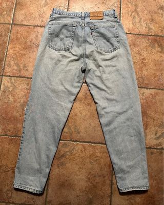 Vendo jeans vintage Levi's. Denim azzurro chiaro con effetto vissuto naturale e strappi sulle ginocchia che donano un look casual e alla moda. Vestibilità mom fit (vita alta, gamba dritta leggermente affusolata). Etichetta Levi's in pelle sul retro e classico dettaglio rosso sul taschino posteriore. • Taglia: IT 42 EU 38 • Colore: Denim chiaro • Condizioni: Buone vintage - segni d'usura e strappi voluti
