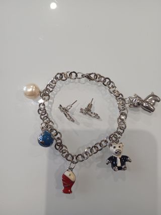 Braccialetto con animali e ciondoli vari e coppia di orecchini a forma di gatto. Ottimo stato entrambi, avendoli utilizzati pochissimo.