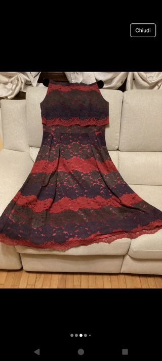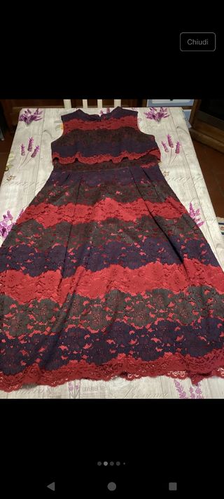Abito tutto in pizzo e foderato internamente con tessuto fresco. Di colore rosso, blu e verde. Utilizzato solo un paio di volte, quindi in ottimo stato. Misure: 120 cm lunghezza, 70 cm dalla vita in giù, da ascella ad ascella 50 cm.