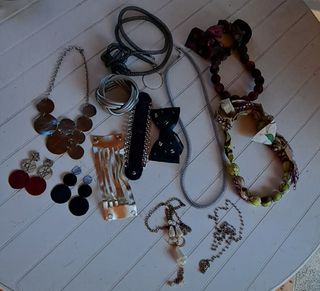Bellissimo lotto di bigiotteria! Perfetto per chi ama accessori unici e di stile. - Include 2 collane lunghe, 2 collane corte, 3 bracciali e 2 paia di orecchini. - Gli articoli sono in buone condizioni, mostrano lievi segni di usura. - Materiali vari: metallo, tessuto, plastica. - Perfetti per aggiungere un tocco di stile a qualsiasi outfit!