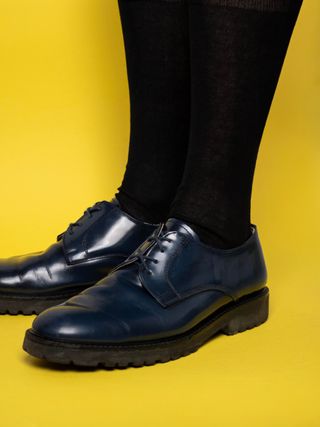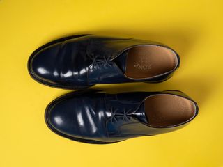 Scarpe stringate in pelle con segni di usura, colorazione blu abrasivato. Le scarpe misurano 41, vestono leggermente larghe.