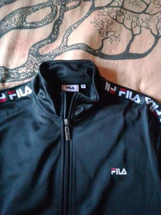 Giacca Fila, modello felpa con zip, colore nero, taglia M. Perfetta per un look sportivo e casual. - Modello con zip frontale. - Dettagli a bande laterali con logo Fila. - Ottime condizioni.