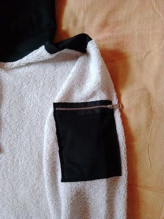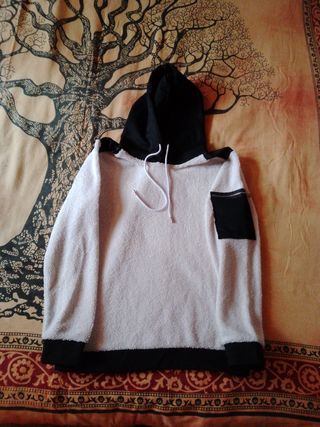 Vendo felpa con cappuccio, in morbido pile bianco e nero. MARCA: Man made in Italy - Cappuccio nero. - Tasche laterali. - Pratica tasca con zip su una manica. - Perfetta per l'autunno/inverno.