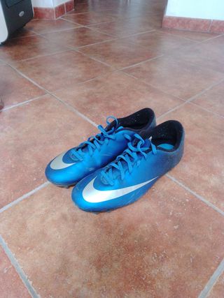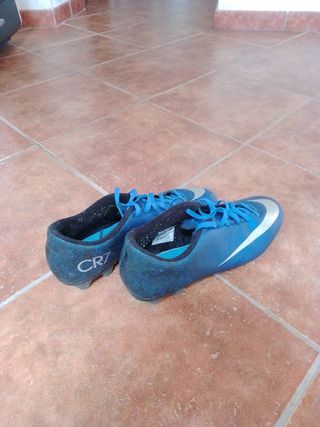 Vendo un paio di scarpe da calcio Nike modello CR7. Sono di colore blu e argento, e presentano un aspetto leggermente usato. ATTENZIONE: HO MESSO SULLE FOTO LE VARIE USURE DEI SCARPINI - Sono adatte per giocare a calcio. - Il modello è CR7. - Sono in buone condizioni.