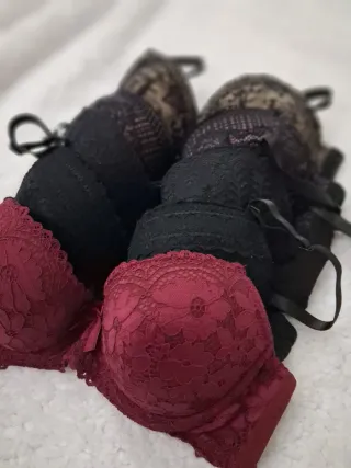 Set di 5 reggiseni con coppe e ferretto, disponibili in diversi colori. Usati qualche volta, pari al nuovo. Taglia 34/75 Coppa B. Corrispondente a seconda. - Design in pizzo. - Spalline regolabili.
