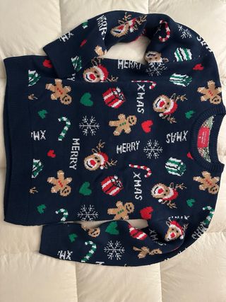 Maglione a tema natalizio con fantasia. - Fantasia con renne, omini di pan di zenzero, bastoncini di zucchero e fiocchi di neve. - Colore blu scuro con dettagli multicolore.