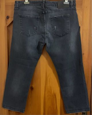 Jeans dal taglio dritto con un tocco moderno. taglia m italiana vedere le misure Jeans nero con peneri in fondo Vita 34 cm...lunghezza 93 cm - Vita normale. - Fondo con frange. - Effetto leggermente sbiadito.