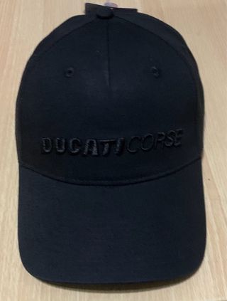 Cappello Ducati Corse di colore nero, con etichetta. - Logo ricamato DUCATI CORSE sul davanti. - Chiusura regolabile sul retro. - Materiale: 100% cotone.