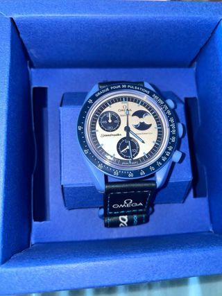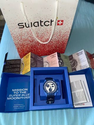 Orologio Swatch x Omega Mission to the Super Blue Moonphase. - Collezione Bioceramic Moonwatch. - Quadrante blu con fasi lunari.
