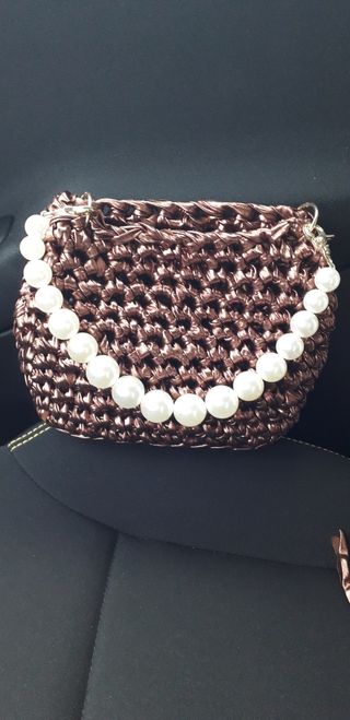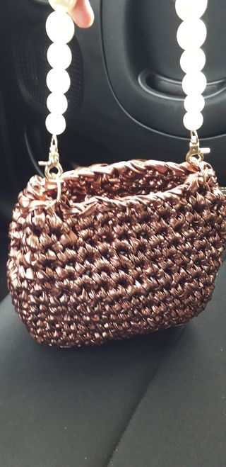 Mini borsa artigianale, perfetta per aggiungere un tocco di eleganza. - Decorata con perle bianche. - Realizzata all'uncinetto con fettuccia bronzo metallizzato Misure 20x15x19