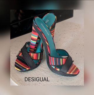 Bellissimi zoccoli Desigual, taglia 39, dal design vivace e accattivante. Sono perfetti per aggiungere un tocco di stile e colore al tuo look estivo. - Modello con zeppa -Buone condizioni, esternamente perfetti, internamente hanno qualche strappo Tacco cm 11,zeppa cm 2