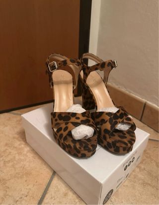 Sandali con tacco alto e stampa leopardata. - Modello con plateau. - Cinturino alla caviglia con fibbia. - Design con fasce incrociate sull'avampiede.