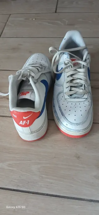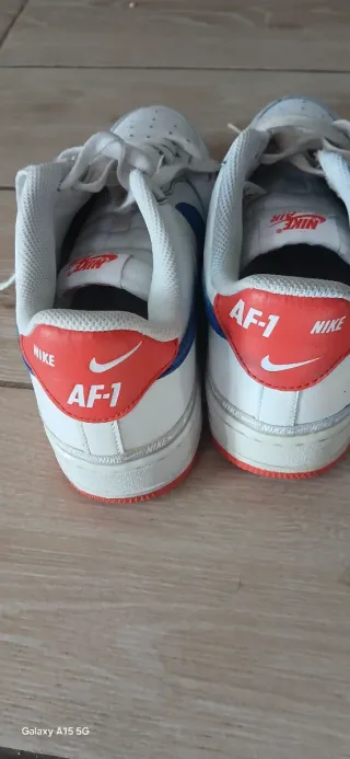 Scarpe Nike Air Force 1 con dettagli rossi e bianchi. - Logo Nike sul tallone. - Scritta AF-1 sul tallone. - Logo Swoosh Nike.