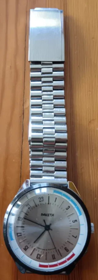 Orologio da polso con quadrante a 24 ore. - Movimento manuale. - Cinturino in metallo argentato. - Quadrante con indici e numeri. - Ghiera esterna con dettagli colorati.