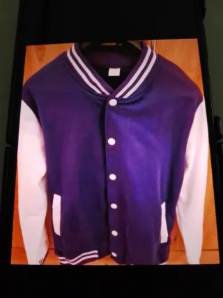Giacca stile bomber con maniche bianche e corpo viola. - Collo a costine con strisce bianche. - Chiusura con bottoni a pressione bianchi. - Tasche laterali. - Polsini e fondo a costine con strisce bianche.