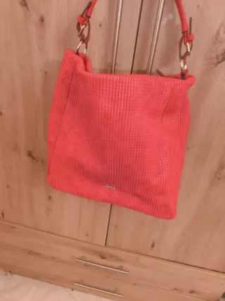 Borsa con un bel colore che unisce arancione e rosso. - Materiale con texture a quadretti. - Manici con dettagli dorati.