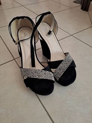Bellissimi sandali con tacco alto, perfetti per una serata elegante. Sono di colore nero con dettagli argentati. - Tacco alto comodo - Dettagli scintillanti - Chiusura con cinturino alla caviglia - Perfette per occasioni speciali