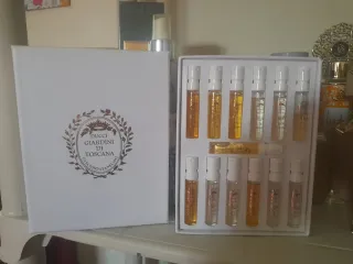 Set di campioncini di profumo Giardini di Toscana. - 12 campioncini di fragranze diverse. - Confezione elegante bianca e oro. Aquistato su douglas profumeria.