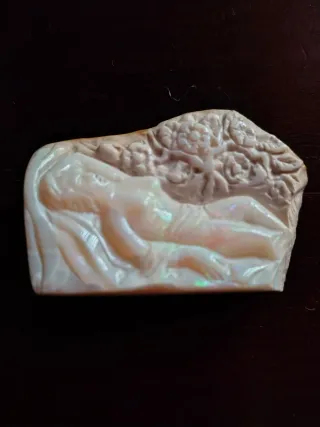 Splendido piccolo pezzo in madreperla finemente intagliata. - Raffigura una figura femminile dormiente. - Dettagli floreali sul retro. - Materiale: madreperla. Cm.3,5 X1,5
