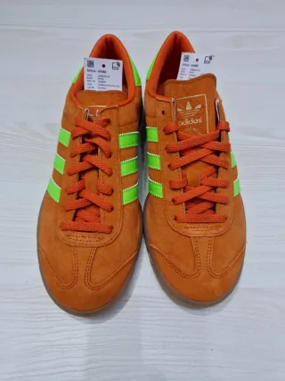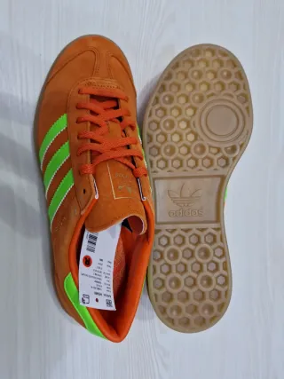 Scarpe Adidas modello Hamburger in camoscio arancione con dettagli a contrasto verdi. - Tomaia in camoscio. - Strisce Adidas verdi. - Suola in gomma. - Chiusura con lacci arancioni.