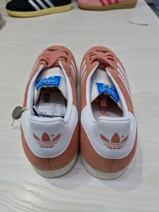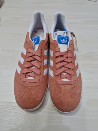 Scarpe Adidas Gazelle in un bel colore rosa con dettagli bianchi. - Tomaia in camoscio. - Strisce laterali bianche. - Suola in gomma.